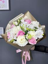 Основополагающий тон в этом букете задают цветы фиолетовых оттенков и яркая упаковка, на которые не возможно не обратить внимания и не остановить на них взгляд. С ними гармонично сочетаются контрастные белые хризантемы и розовые кустовые розы. Букет особенно подходит девушке, женщине, маме, знакомой или коллеге.
